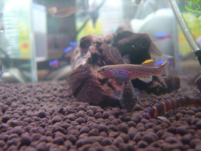 こんな風に出てきて、他の魚を蹴散らし餌を食い尽くすと猛スピードでまた流木の隙間に戻っていきます。